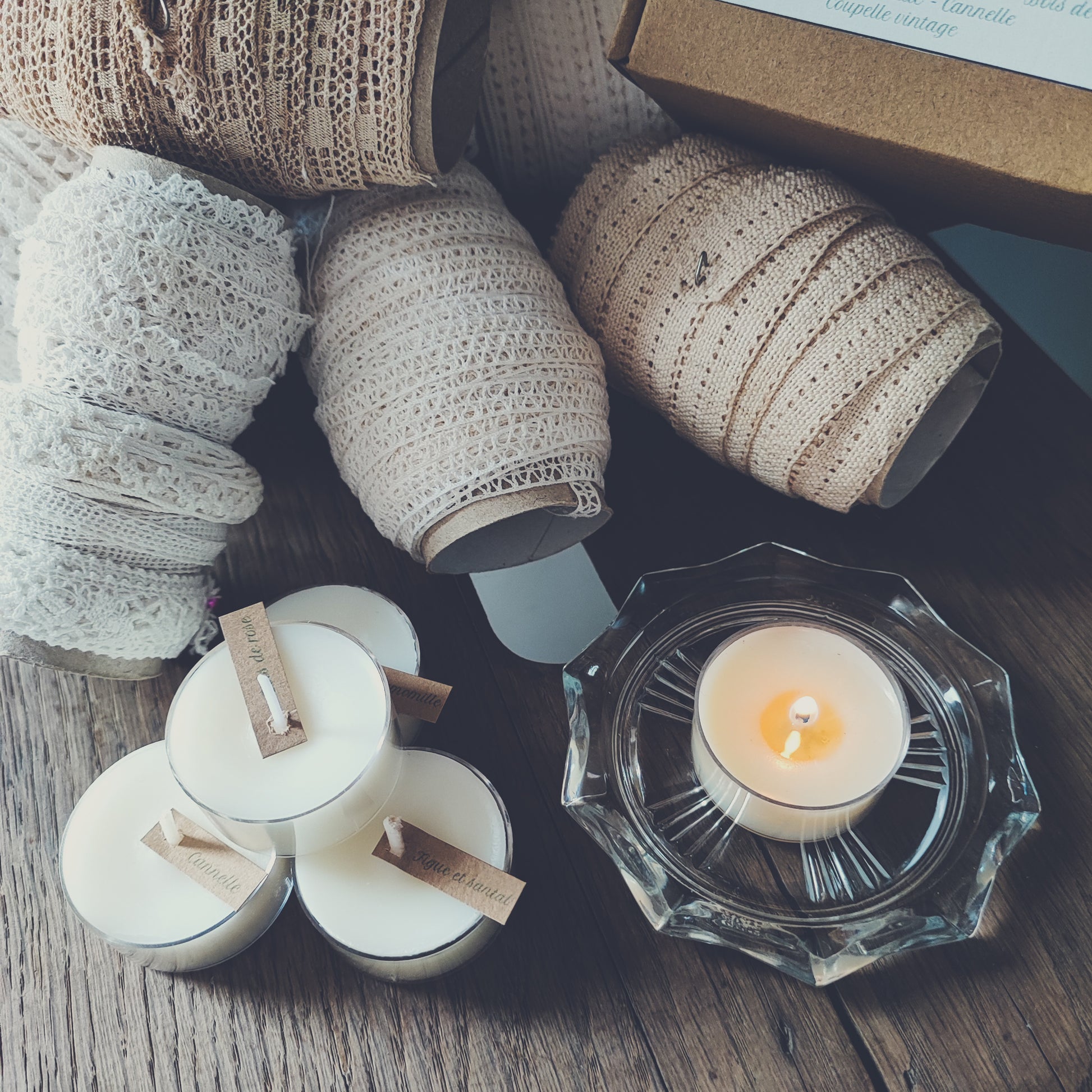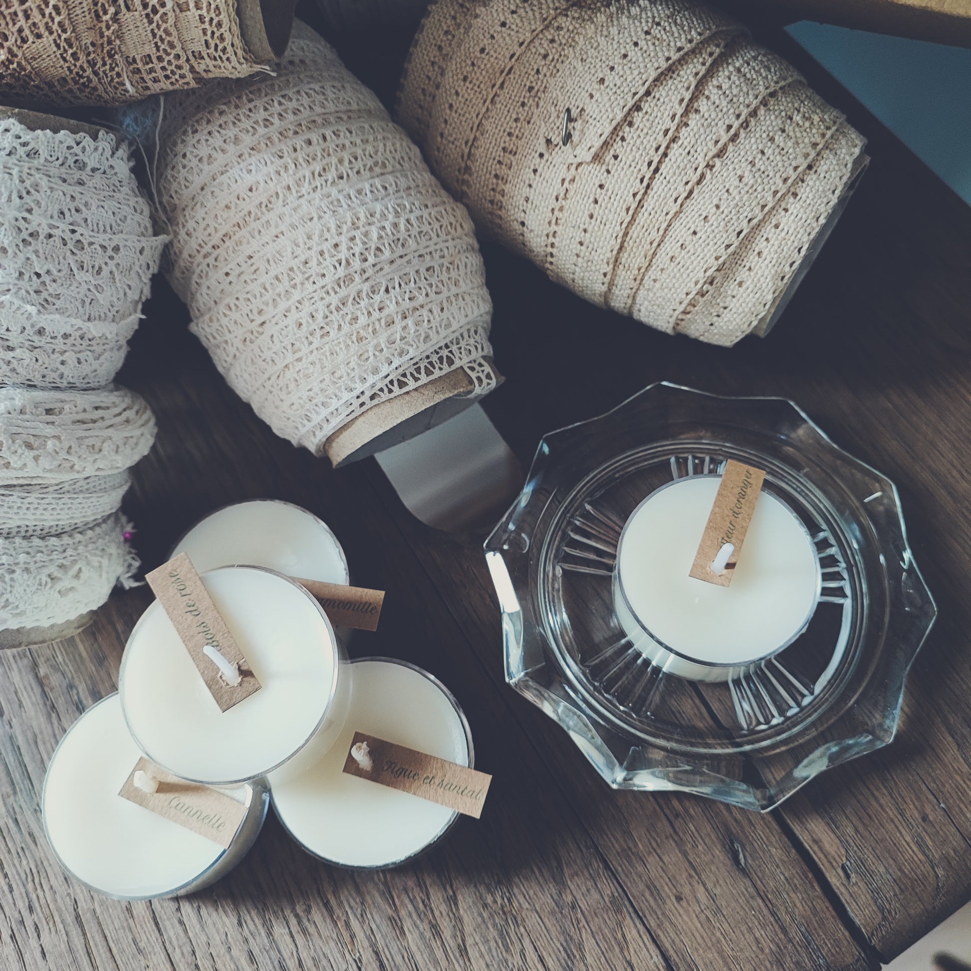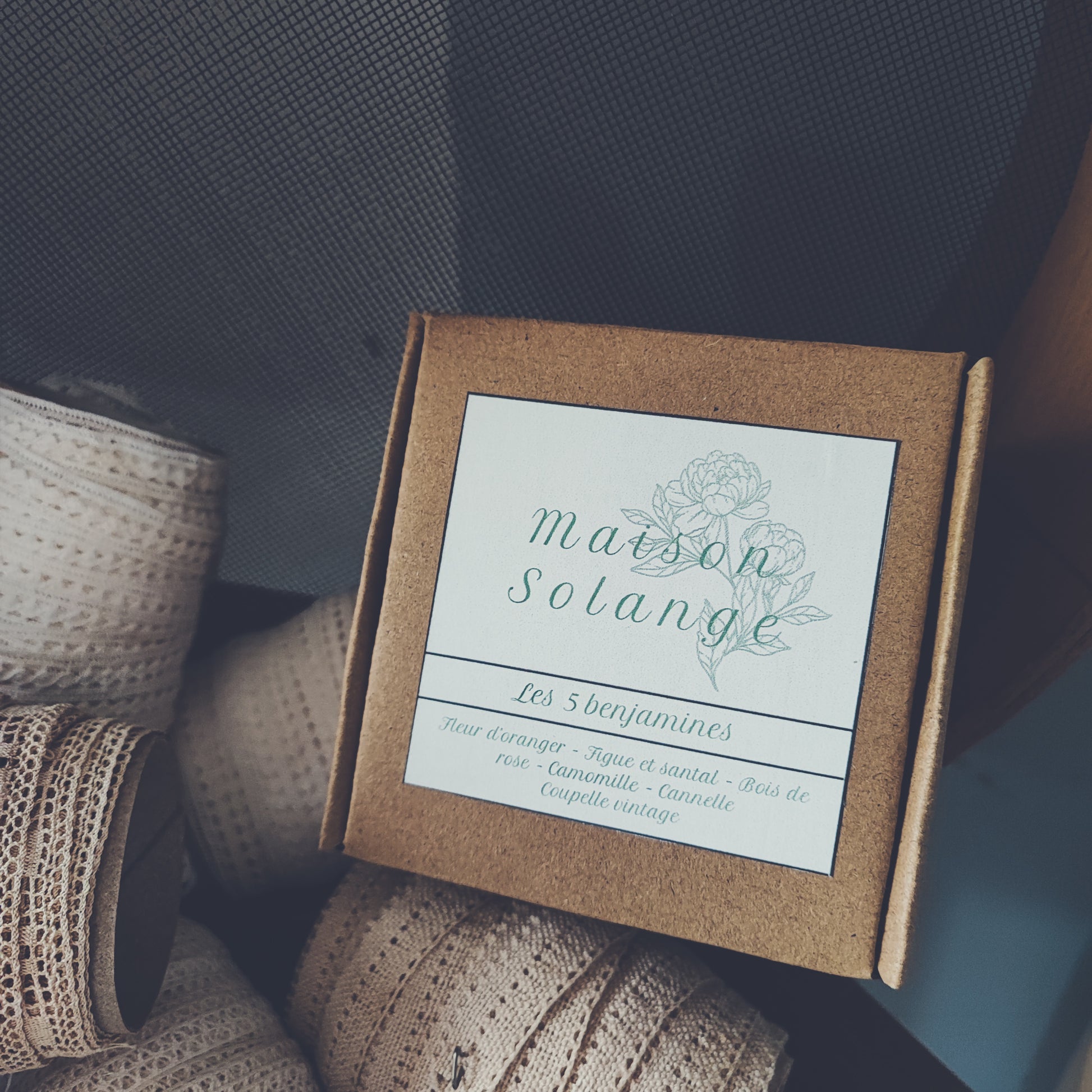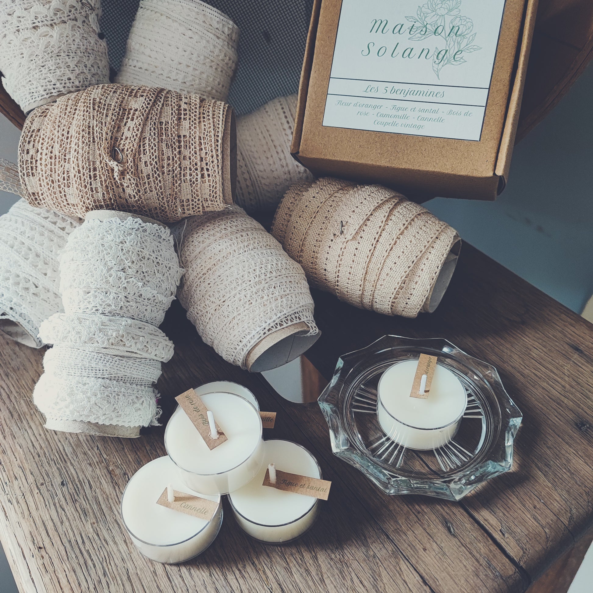 Retrouvez 5 benjamines (bougie de 18G) parfumées et leur coupelle vintage :